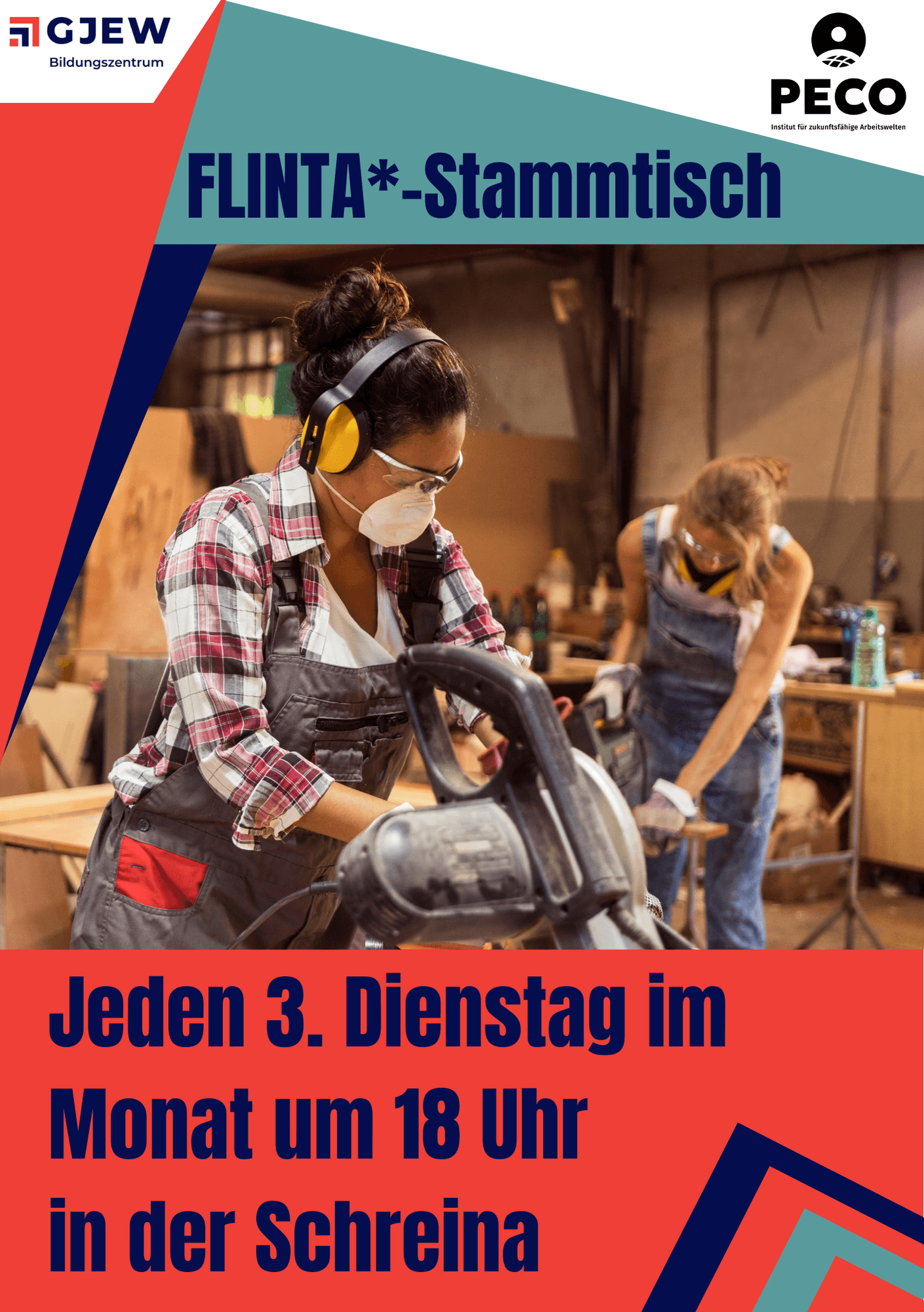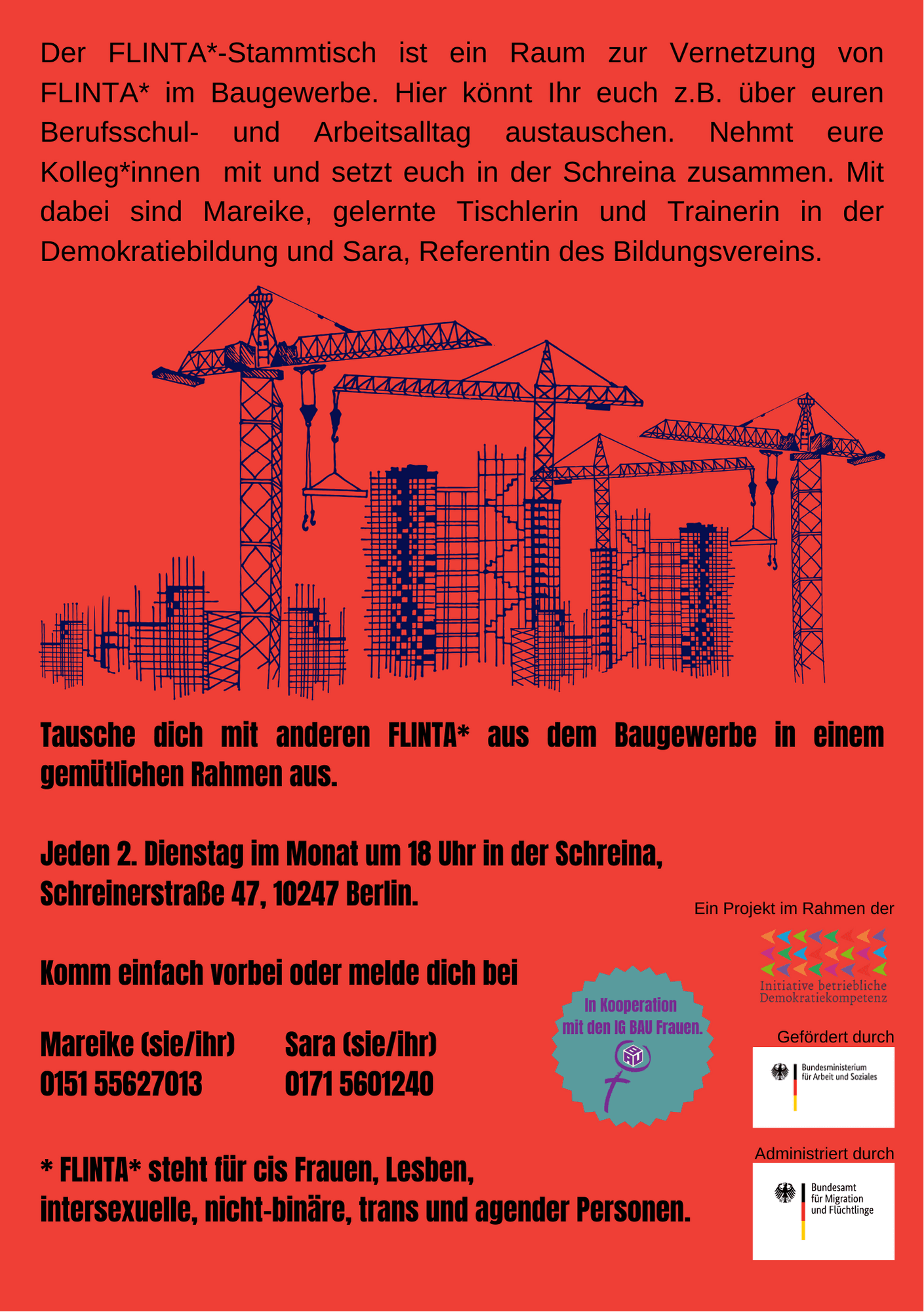 Gemeinsam mit der GJEW (Gemeinschaft Jugend, Erholung und Weiterbildung e. V.) bieten wir einen monatliches Vernetzungstreffen für alle FLINTA*-Personen im Berliner Baugewerbe an.